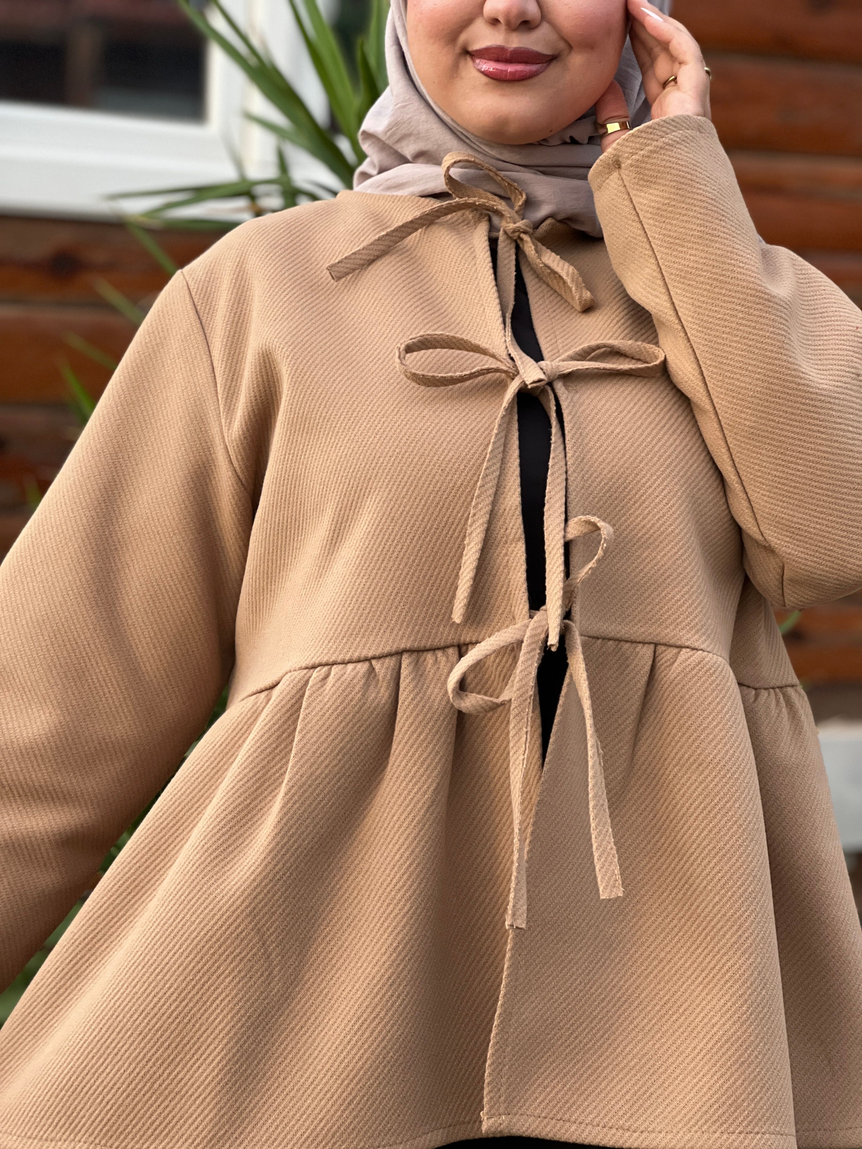 تصميمه الفريد بـقصة واسعة وانسيابية يمنحك حرية حركة كاملة مع مظهر راقي يحترم مبادئ الاحتشام. الأربطة الزخرفية الأنيقة على الواجهة تضيف لمسة من الرقي والأنوثة، مما يجعل هذا الجاكيت إضافة مميزة لخزانتك.